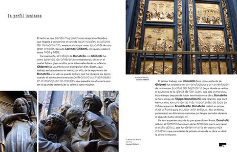 Como niño travieso en las aguas del origen Donatello buceaba adentro de las piedras y descubría en el mármol los rostros de los santos; buceó después en el metal del tiempo bajo la noche limpia de Florencia o en los caminos que llevaban a Roma y obtuvo los tesoros de la mañana limpia del mañana. Donatello veía lo que otros no veían y buceaba, exploraba, descubría el alma oculta de la historia adentro de los bronces y los bloques de mármol de Carrara. Donatello buceaba y creaba en silencio los rostros de Judith y los apóstoles o hacía volar, en bronce, el caballo ligero del general Gattamelata para que éste subiera al cielo en su montura Donatello buceó para que viéramos un perfil luminoso —pero en bajorrelieve— del futuro del hombre y de la historia.