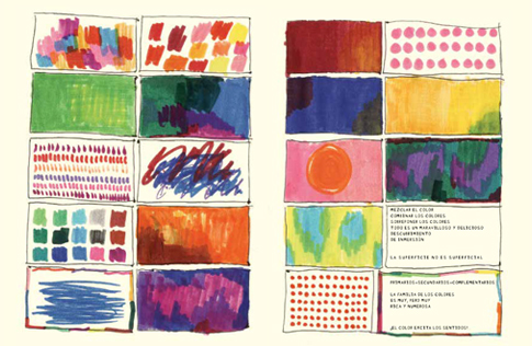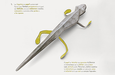 “Yo, un pintor que pinta animales de papel, he visto animales como los que hago —dice Manuel Marín—. Los míos son planos. Y todos están pintados hasta con dibujitos. Un cocodrilo, al pintarlo, puede ser azul como el agua, si está sumergido; o amarillo, si no lo está.” Por eso, los animales de este libro son formas pintadas, recortadas y dobladas, pero nunca son iguales. Una vez que se traza e ilumina sobre un papel, se crea una superficie colorida; entonces, ese color se corta y se dobla junto con el papel y se arma un volumen de color recortado: un animal hecho con las manos.