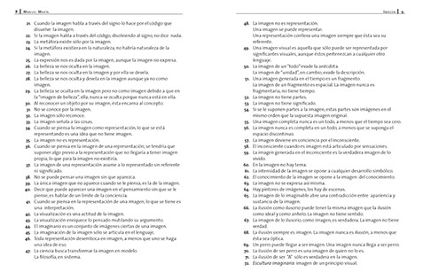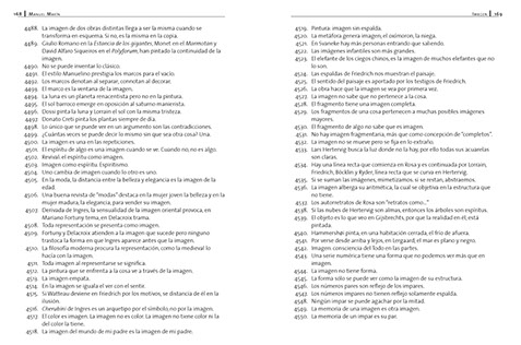 En estos más de 5000 enunciados, citas y descripciones inconexas se llegan a vislumbrar siete tesis complementarias y hasta contradictorias que suponen el ámbito donde aparece la imagen, ocultándose ante cualquier definición posible.