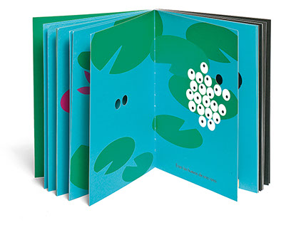 Las imágenes coloridas y alegres de este libro se modifican gracias a la superposición de páginas con troquelados de formas básicas. Poco a poco vemos como se construye un relato con el cielo, la lluvia, el estanque, las huevas, el renacuajo, la rana y la lechuza…