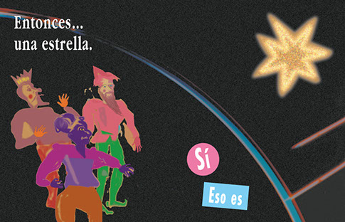Sin embargo, Dominique Jorand da ligeros vuelcos a la historia con saltos interactivos que motivan al niño a contarla él. De repente, la “aventura” de los tres Reyes Magos se torna adivinanza.
