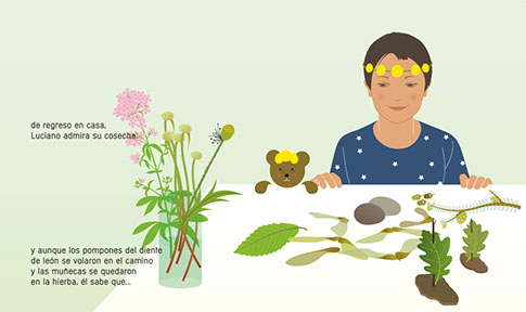 Una madre le enseña a su hijo a cambiar sus juguetes por lo que la naturaleza le ofrece. Durante un paseo, la semilla de arce se convierte en helicóptero, el diente de león en paracaídas y la amapola se transforma en muñeca. Este libro es una invitación a abrir los ojos y crear escenarios divertidos a partir de la naturaleza.