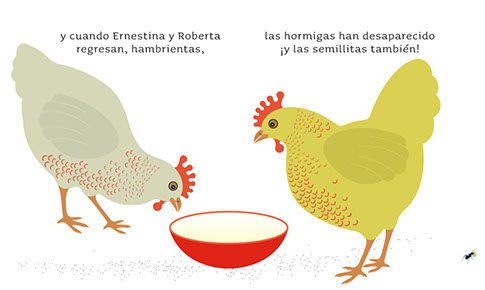 Una colonia de hormigas se está invitando a sí misma a comer del plato de las gallinas, corre y corre toman la comida para hacer su recorrido subterráneo dentro de la colonia. ¡No tienen tiempo para cantar con la cigarra o tomar el sol con las catarinas! Un agujero en la página va llevando al lector del exterior al interior del hormiguero, de la luz a la oscuridad.